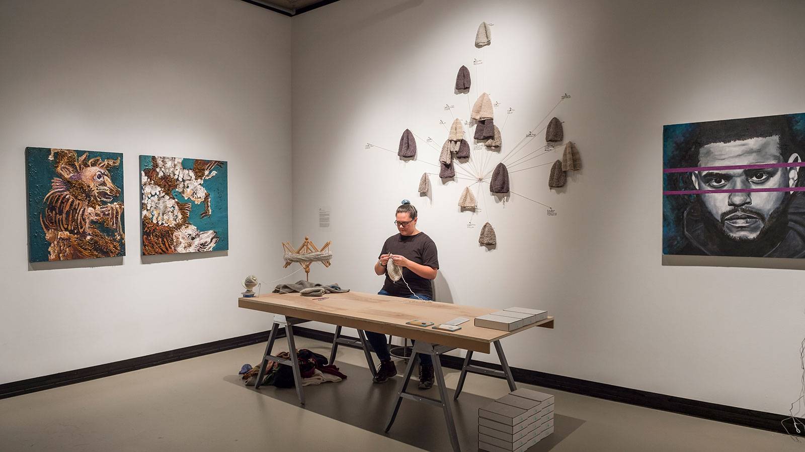 For the installation Casting Off at Clifford Gallery, Kris Pfister ’17 collected discarded clothing and reused the yarn to make hats for LGBTQ homeless over the course of 31 days.