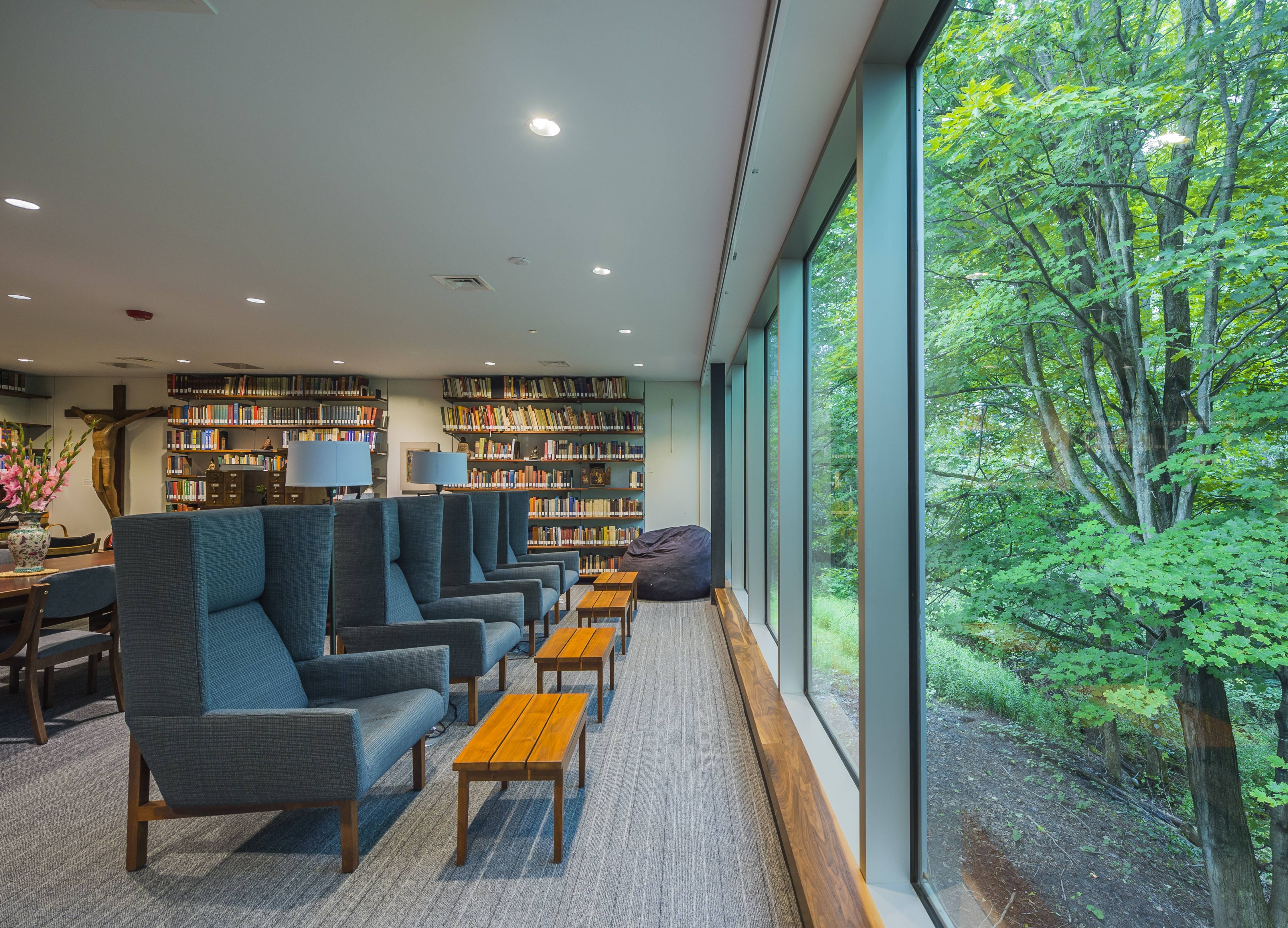 Instead of pews, our chapel features individual chairs. This design choice was made so that a person can sit comfortably for long periods of time.