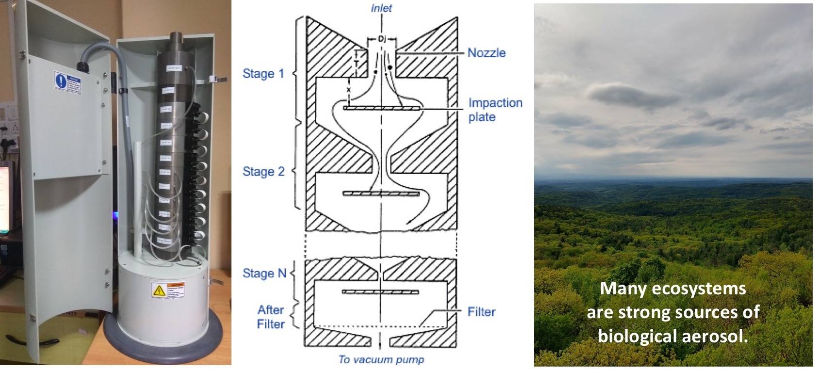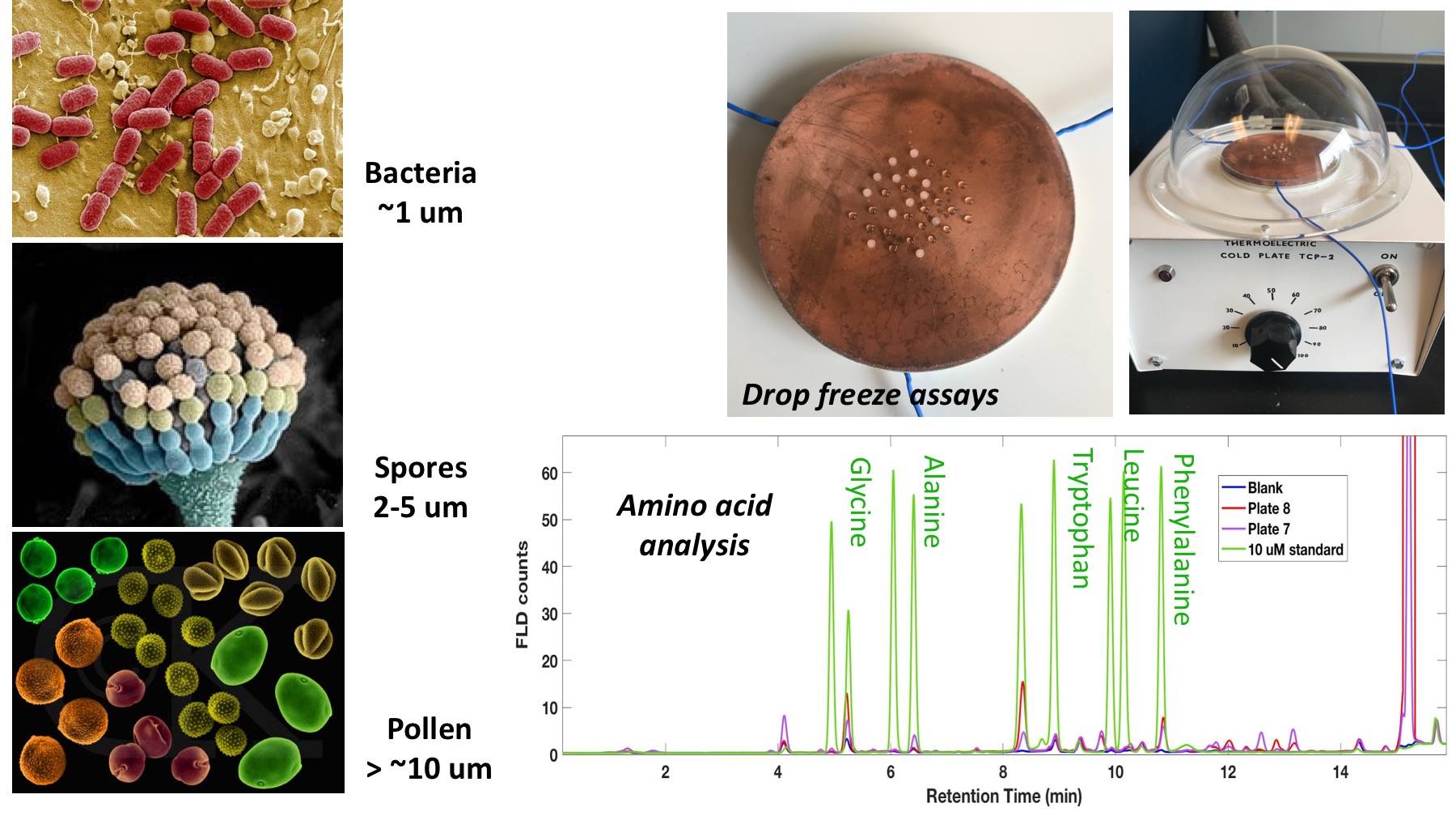 To study primary biological aerosol (PBA), composed of bacteria, fungal spores and pollen, we use a number of tools. First, we have a Micro-Orifice Uniform Deposition Impactor (MOUDI) which collects size-resolved aerosol from 50 nm to 18 μm. We install the instrument in an outdoor location to collect atmospheric samples which we analyze for deposition-mode ice nuclei as well as biomarkers like amino acids and fungal alcohols. We also have a real-time single particle fluorescence instrument (the Instascope) which provides high time resolution data and helps us put our offline measurements into context. We are interested in seasonal cycles of biological aerosol, the behavior and composition of biological aerosol and ecosystem response to meteorological and climatic events.