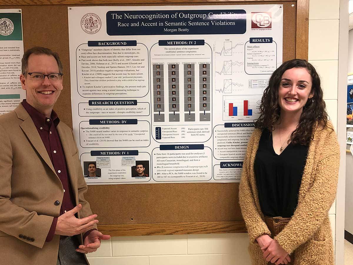 Morgan Beatty (Neuroscience and Education, '20) and Prof. Kelly in front of Morgan's senior thesis poster.