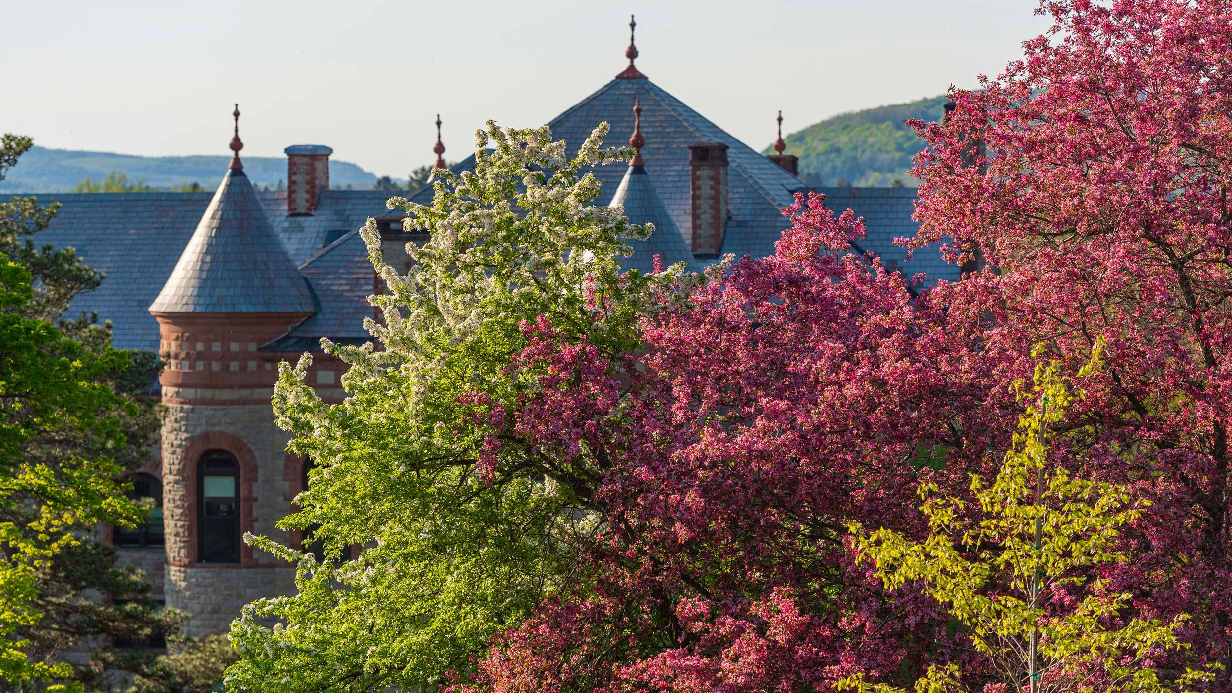 Spring is one of my favorite times of year to photograph the Colgate campus. There is always a short window of time to capture the flowering trees before the blossoms are lost to wind or rain. I have often composed the rooftop of James B. Colgate Hall with fall foliage but not with the blossoming trees. This year I had my opportunity.