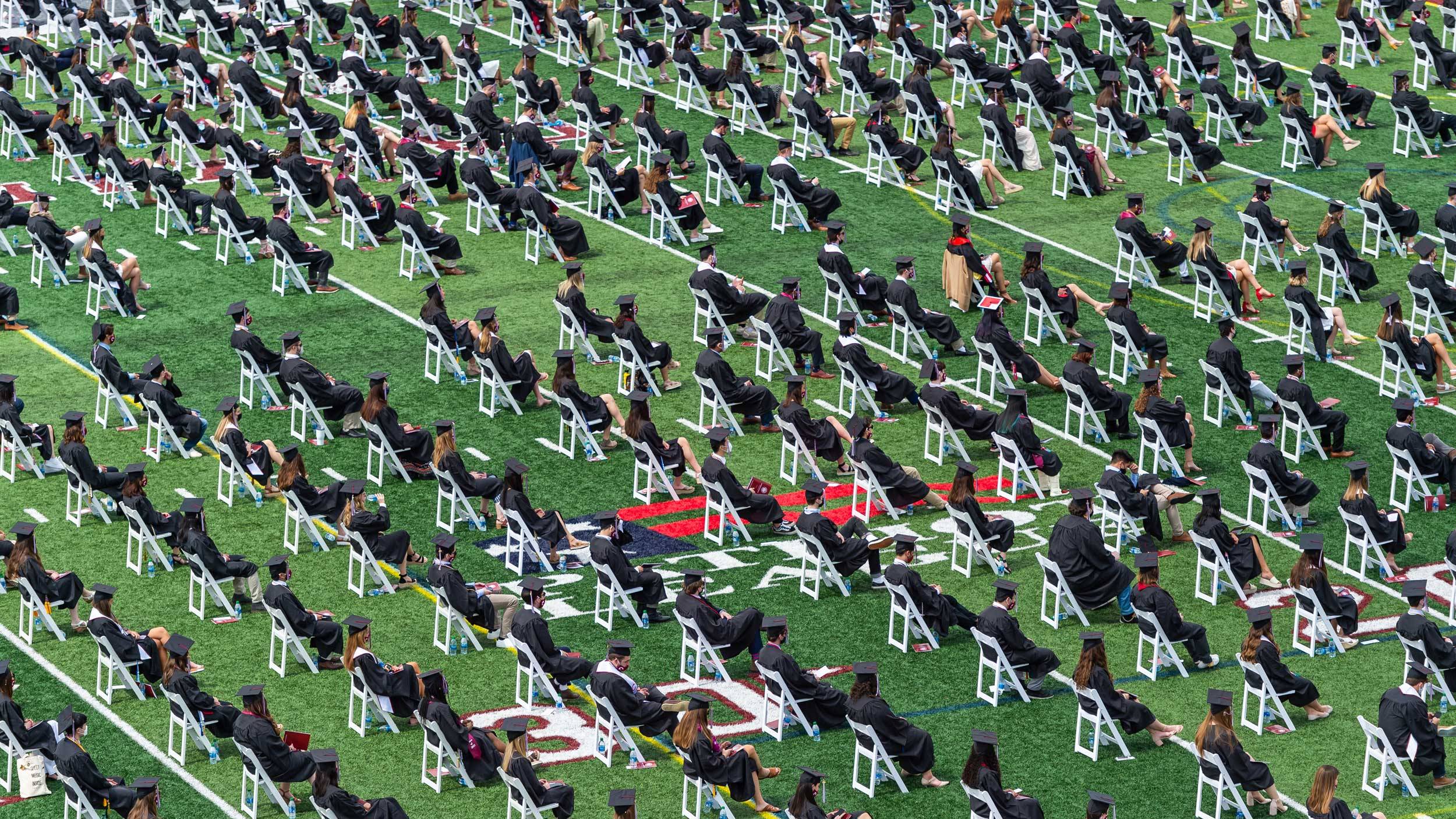 Throughout the 2020–2021 academic year, I kept looking for opportunities to photograph the ways in which Colgate was adapting to the pandemic. This particular image of the graduates socially distanced while waiting for their names to be called is one instance that summed up what we had gone through as a campus and how far we had come during a challenging time. I believe that it also captures a historic moment in the story of Colgate as well.