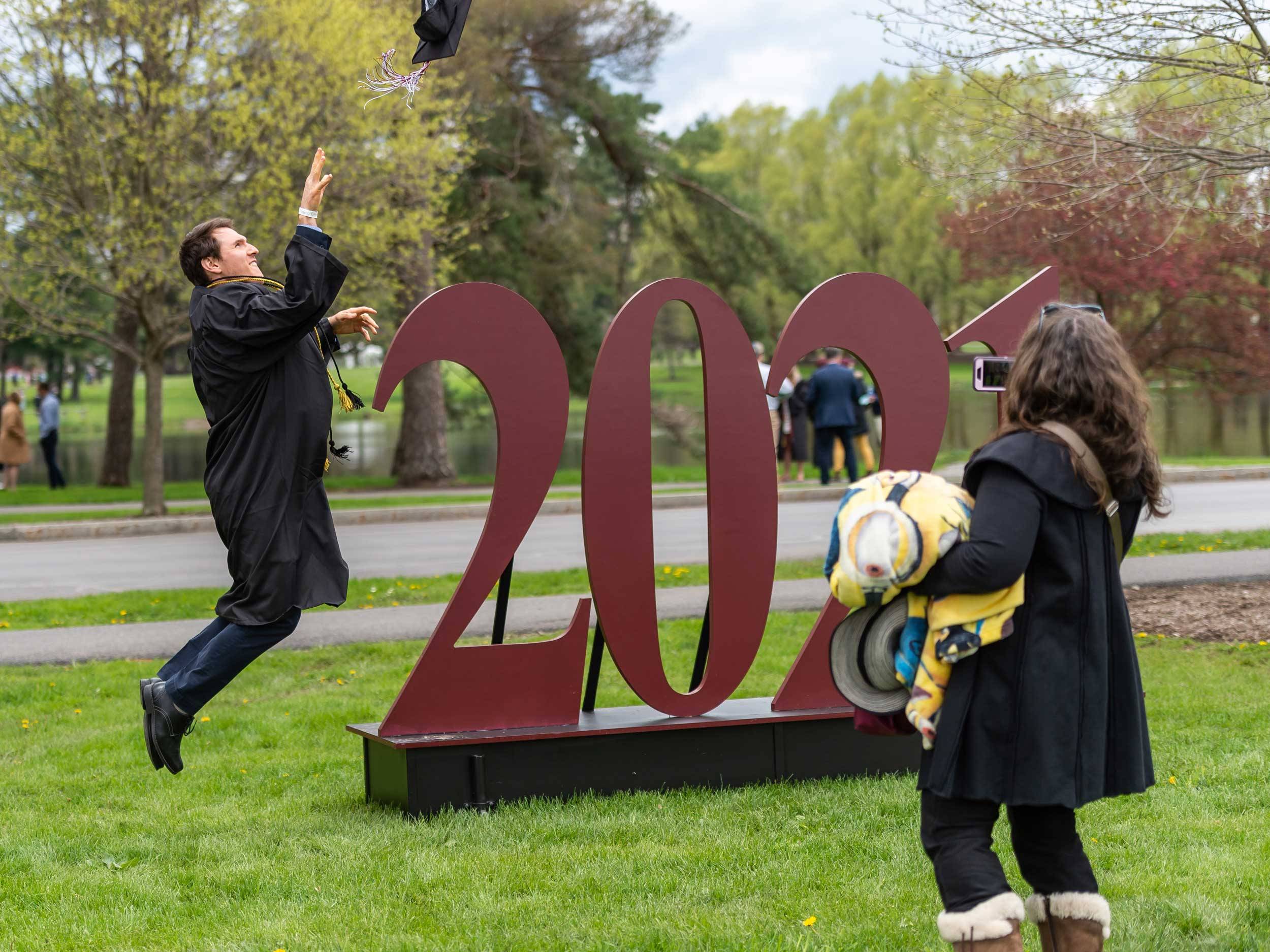 Unexpected moments are always a welcome sight for me and something I look to capture when covering our events. I made this image following commencement as I waited for graduates and their families to take photos with the 2021 sign and enjoyed that it was a different scene instead of traditionally posing with the date.