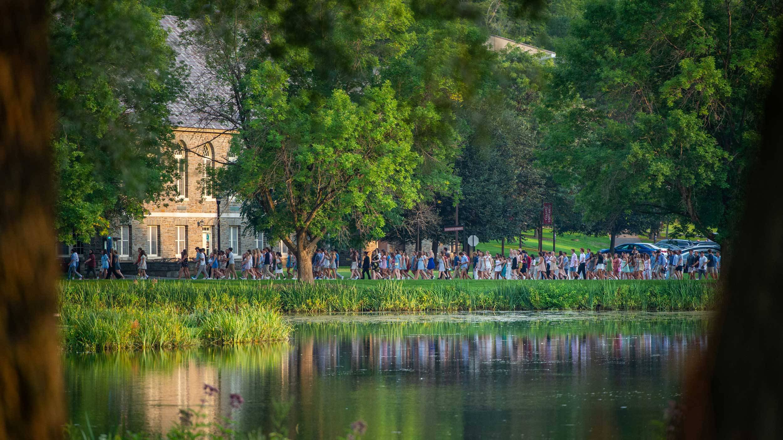Convocation officially marks the beginning of the academic journey for our incoming class. This year, the convocation ceremony was held in a tent by Willow Path instead of being held in Memorial Chapel. This presented a unique opportunity to photograph the procession of students by Taylor Lake, framed by two of the trees on Willow Path.