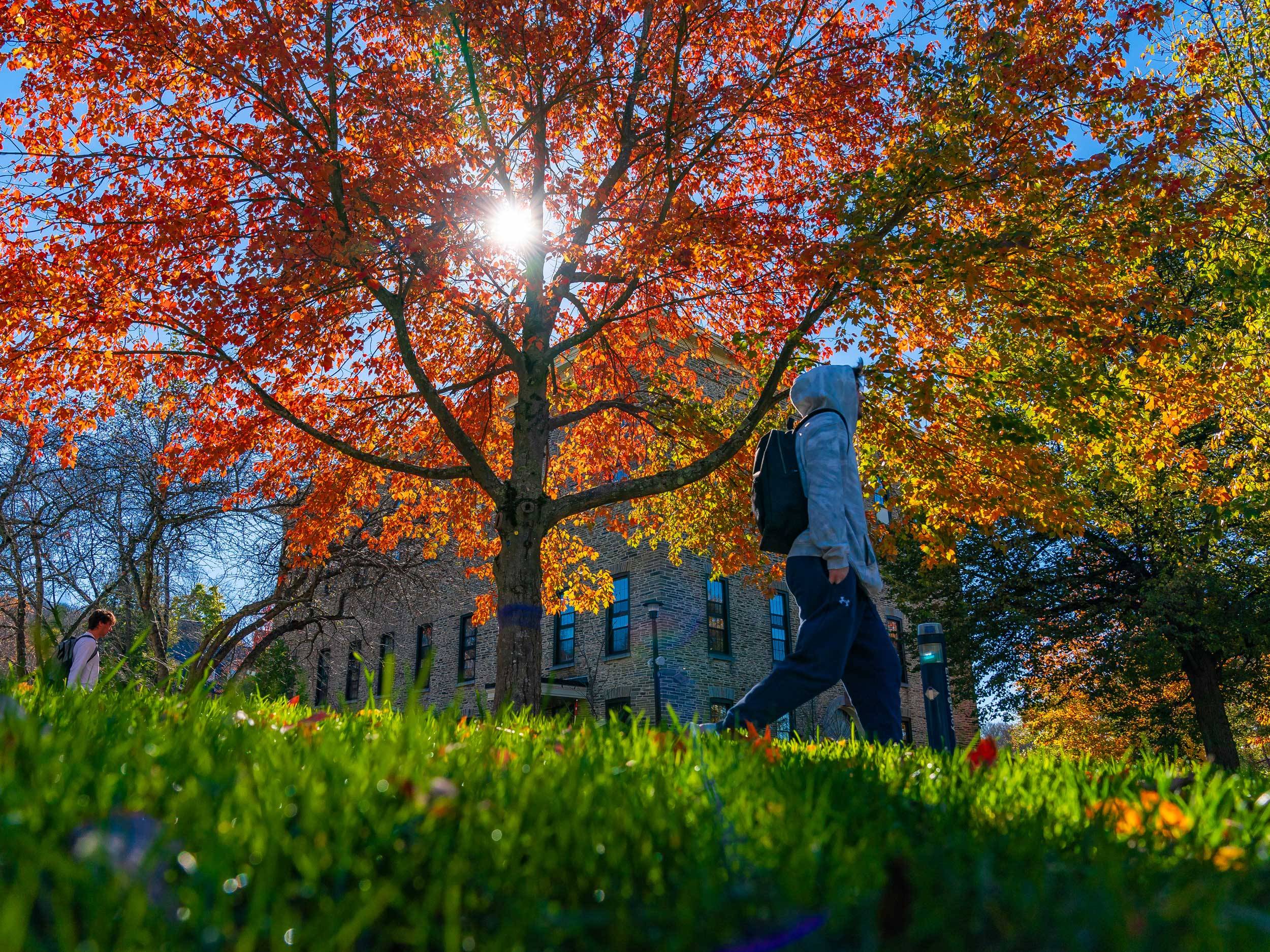 As we headed into autumn this year, I had heard from not only the weather forecasts but also members of the community that this season was not going to be good for foliage photos due to too many warm nights in September. I still sought out areas that had particularly promising trees and worked on a different approach to photographing scattered pockets of color, like this tree on the Academic Quad in front of Alumni Hall.