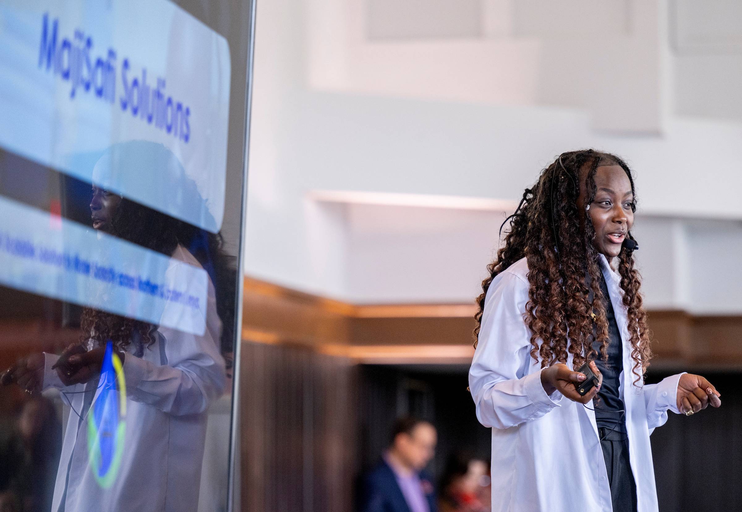 Strobel-Larsen also introduced the Weiner Family Entrepreneur in Residence, Jen Martin, co-founder of Pipcorn. Martin leads the TIA program and mentors pitch competition participants. Ventures included EchoScape, founded by Mike Ahearn Wilcox; Hatch Pay, co-founded by Fletcher Goodell ’26 and Anders Larson; MajiSafi Solutions, founded by Agnes Ndanu ’28; and PLNT, founded by Porter Comstock ’26.