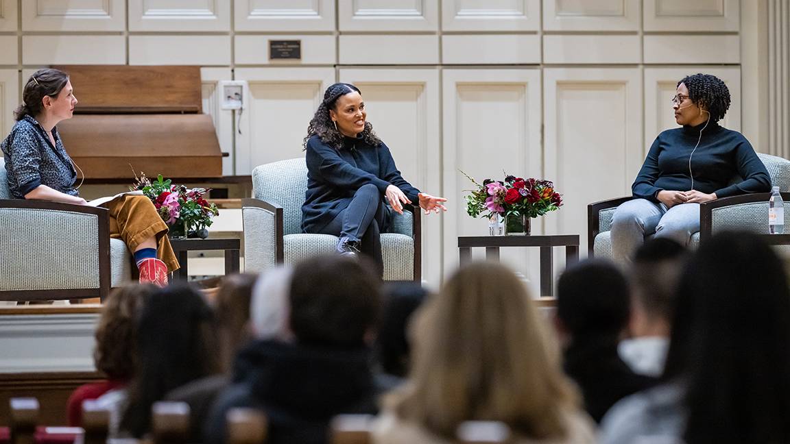 Author Jesmyn Ward appeared in the chapel on Friday evening as a special guest in Colgate’s Living Writers series. The first woman and person of color to win the National Book Award for fiction twice, Ward answered questions from Colgate students and talked about the nuances of her work, her creative and writing processes, and her sources of inspiration. Ward also shared her desire to amplify the voices and stories of those who have been marginalized or had their histories erased, and the important role stories have in linking our past to our present.