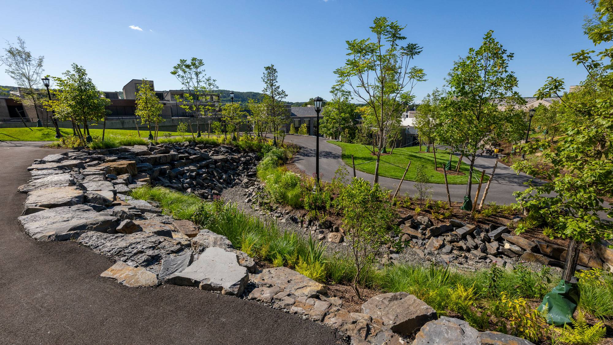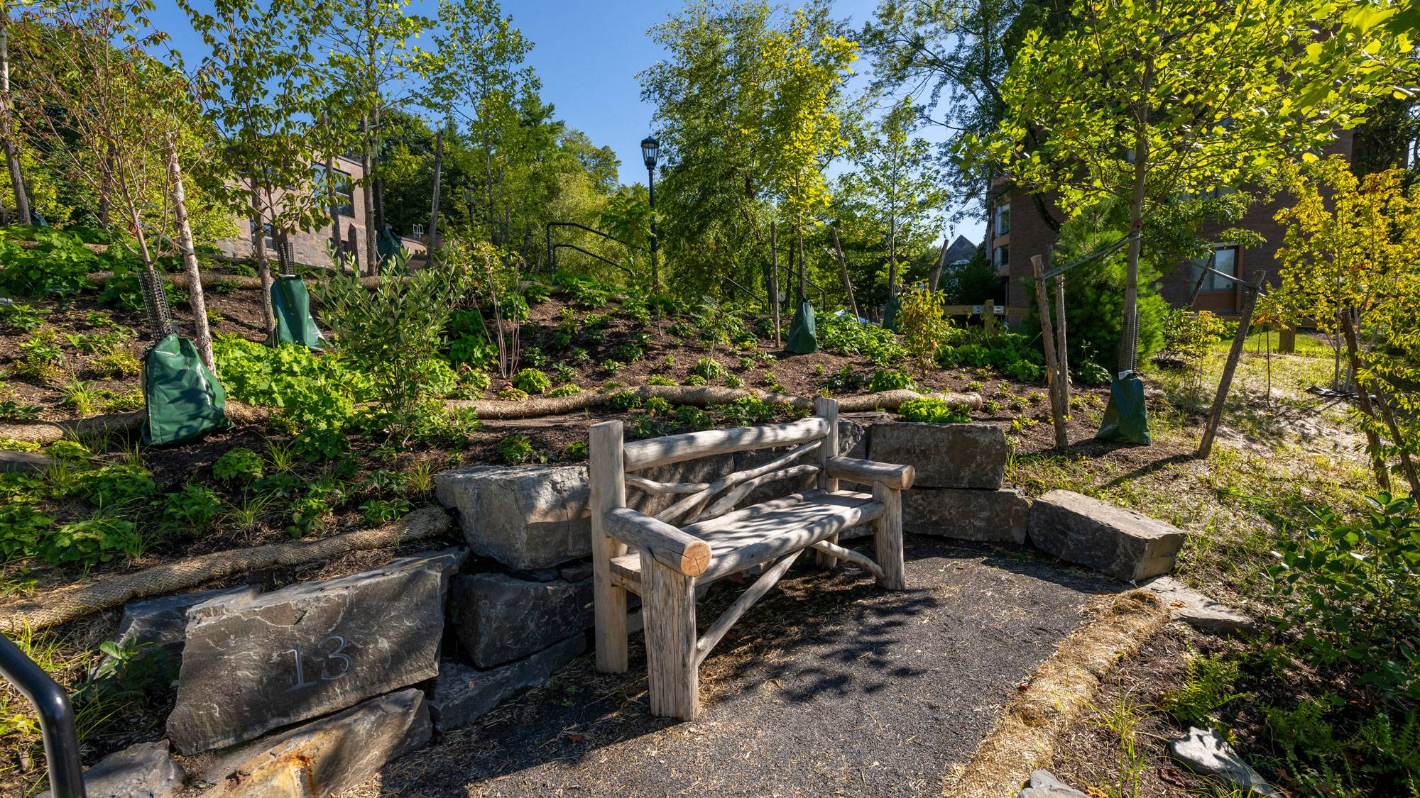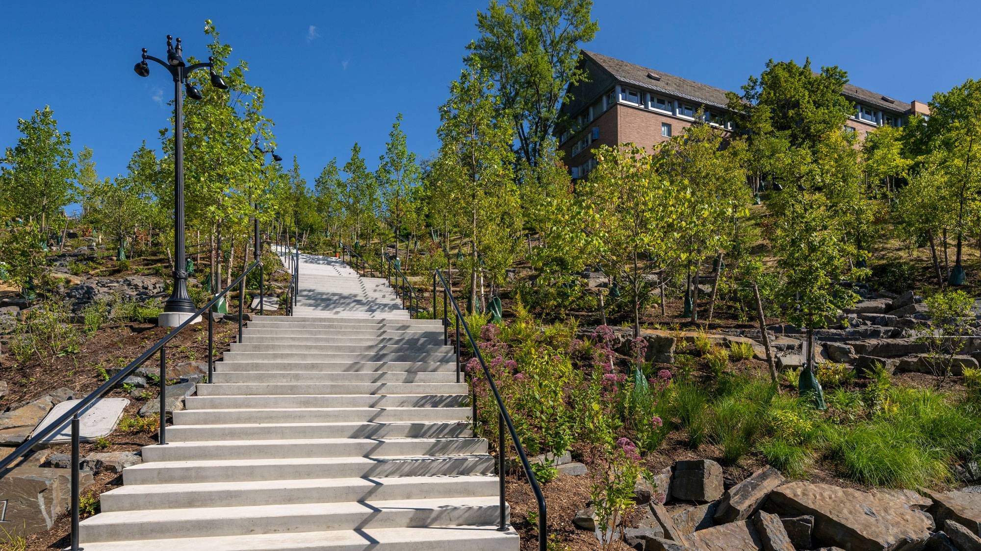 Construction of Peter’s Glen began in March 2024 and continued into 2025 with the installation of stone walls and oak terraces by Little Hall, heated precast stairs, extensive stonework, and hardscape plazas and pathways. The project called for the planting of nearly 500 trees, more than 500 native shrubs, and thousands of smaller understory plants.