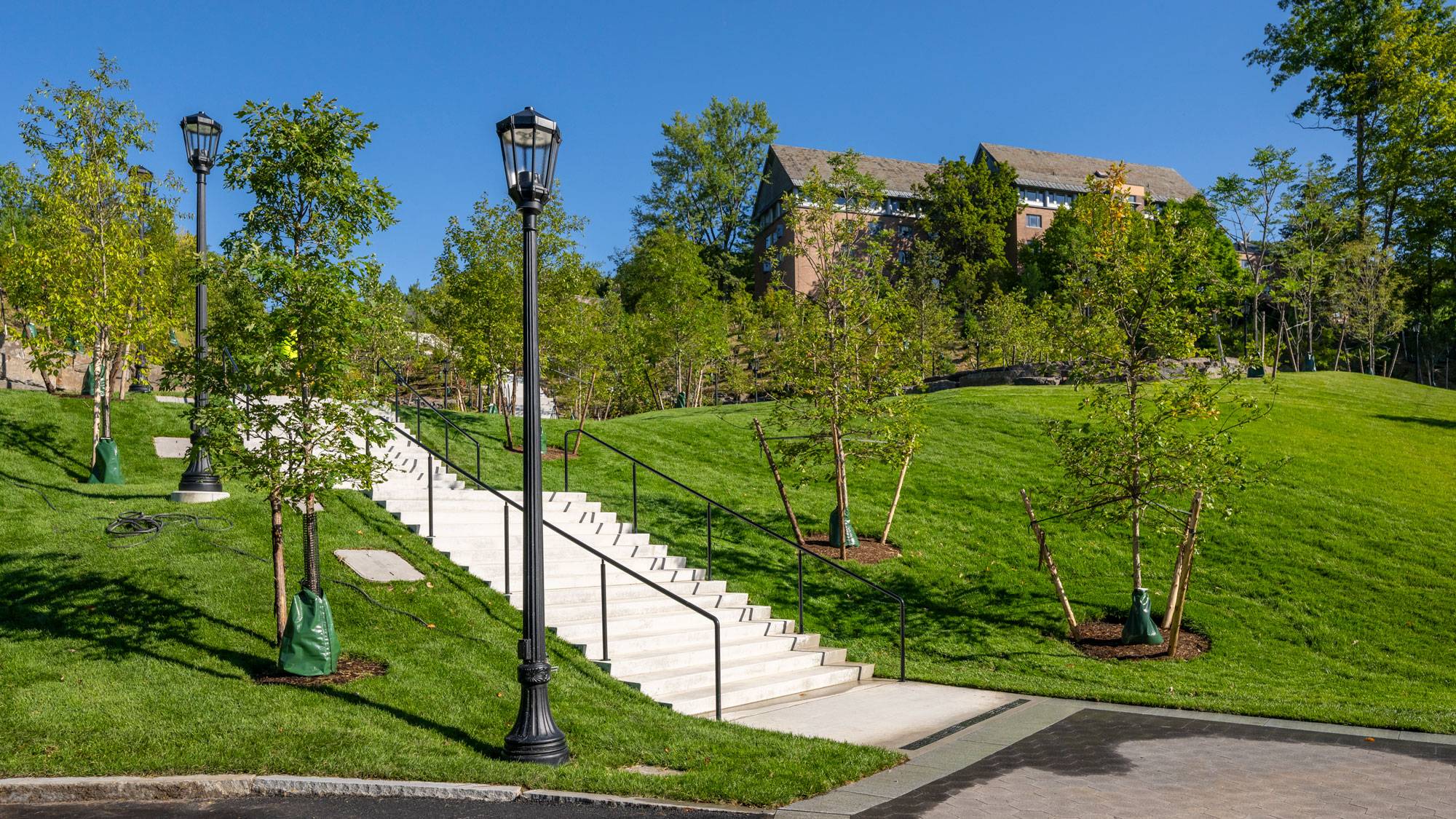 The large vehicle traffic circle by Frank Dining Hall has now been converted into a new upper plaza for improved pedestrian safety, ease of access, and a greater natural connection with the surrounding landscape. The plaza features stone pavers, boulder seat walls, new site lighting, and tree and understory plantings. A new lower plaza at the south side of Ryan Studio connects the project’s main stairway and pathways to Colgate’s new Bernstein Hall. These plazas provide new campus locations for gathering and studying.