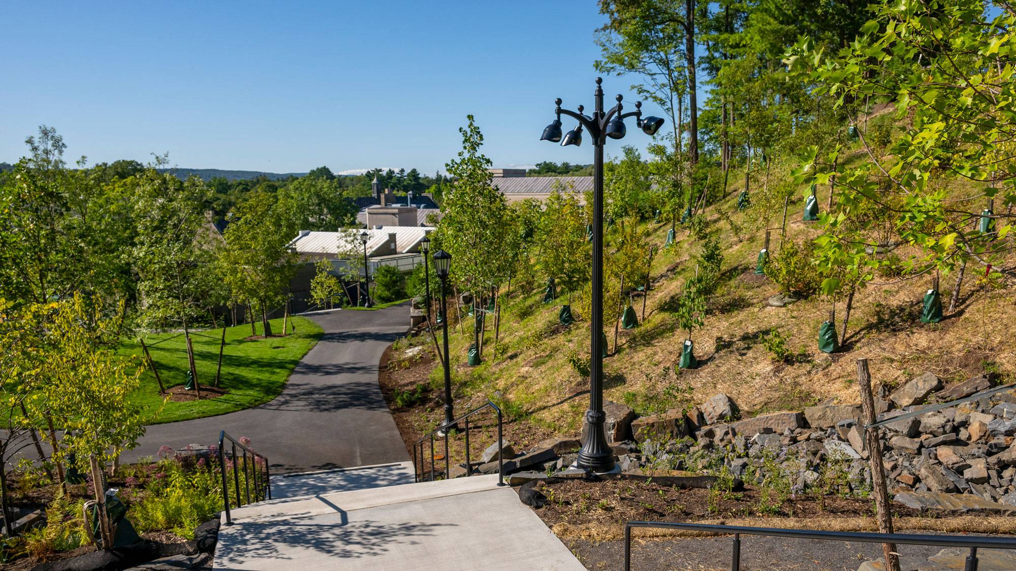 Colgate University has opened Peter’s Glen, a new 2.5-acre, landscaped corridor that connects both campus landmarks and academic buildings at one of America’s great national liberal arts institutions. Members of the Colgate community can now move directly from the doors of Bernstein Hall and the Dana Arts Center in Middle Campus up to the Academic Quad, following a pathway of remarkable beauty, designed by Michael Van Valkenburgh Associates (MVVA). This project has been made possible by the glen’s namesake, Peter L. Kellner ’65, P’87, GP’16,’19, who fully funded the work to create the new campus landmark.