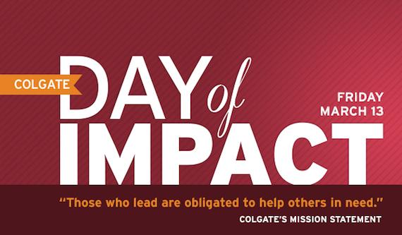 Today is Colgate Day of Impact. There is still time to register at Colgate.edu/DayofImpact. Below is a list of some of the 1,500+ events that are happening today. View them all here. Abigail Gilman ’19, an incoming first-year student registered and wrote: “For my first Colgate Day (Class of 2019!) I will be donating blood for the […]March 13, 2015
