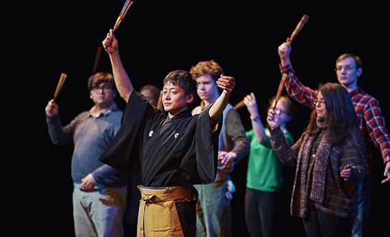 The curtain in Brehmer Theater opened to reveal Yamai Tsunao kneeling under a single spotlight on stage. He was dressed in a stiff, dark-colored Hakama costume, and his only prop was a brightly colored fan. He sang in a deep, full voice, moving through a series of deliberate, careful gestures.February 26, 2015