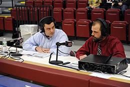 Two alumni, Katie Garman Kammerdiener ’10 and Pat Campolieta ’02, returned to Cotterell Court this past season. But, instead of dribbling up and down the court, the former basketball players sat in as the color commentators.