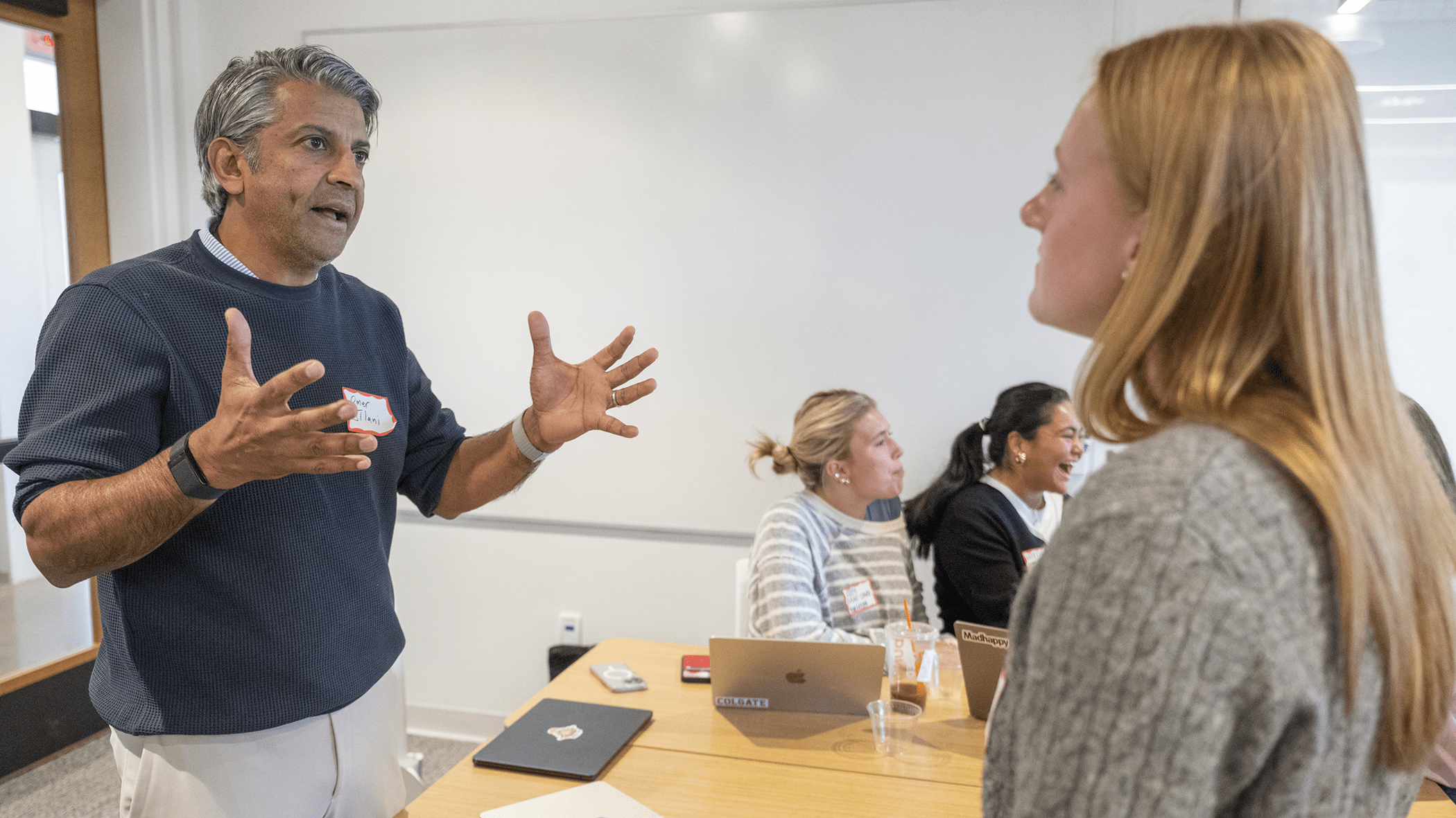 Mentor Jason Griswold ’97—who served on a review panel with mentors Alex More ’99 and Omer Jilani ’93, P’28 and keynote speaker Kate Brodock—shared his thoughts about the two pitching ventures. (During every Incubator session, a pair of ventures pitch to close the morning session.) Speaking about Shneer Agritech, a venture led by Diya Badola ’25 and Jahanvi Chamria ’28, and Vitalize, founded by Talia Broder ’28, Griswold said both pitches “hooked the investor right away with a story and problem that we all can relate to. It allows the investor to lean into the data and value prop rather than spending the whole pitch wondering what it is and how it’s relevant.” One thing that surprised him, in a good way, from both pitches was the fact that they have prototypes and are working through data. “[There is a] big difference versus having an idea on paper with massive assumptions,” said Griswold.
